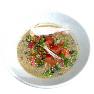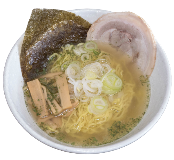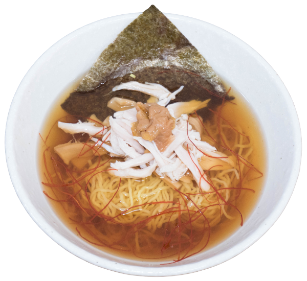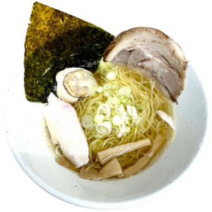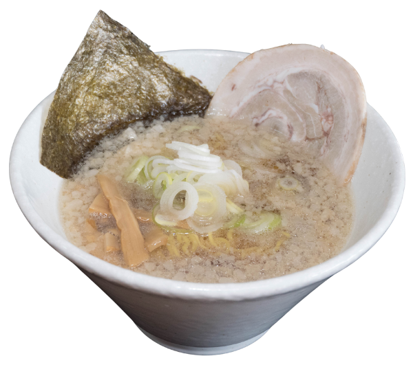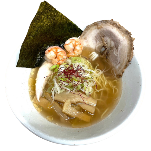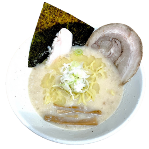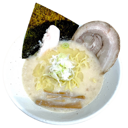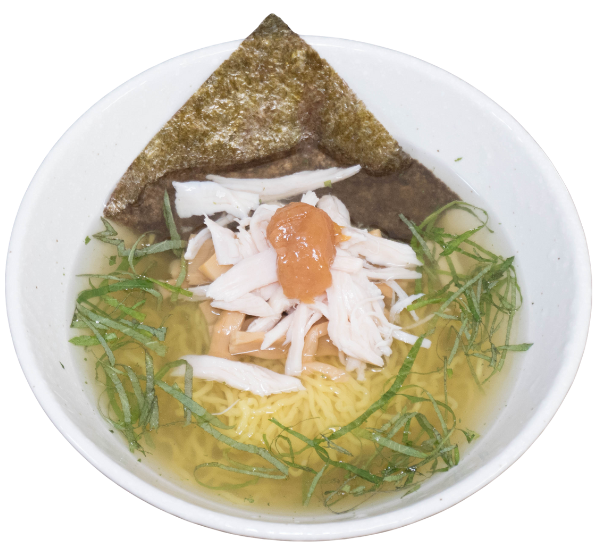 牛骨、豚骨、鶏のモミジ、数種類の魚介類、野菜、果物をブレンドし、白濁させないメインのクリアなスープやその他限定スープと、オリジナルの極細縮れと中細ストレートのコシのある自家製多加水麺を合わせた特製ラーメン。